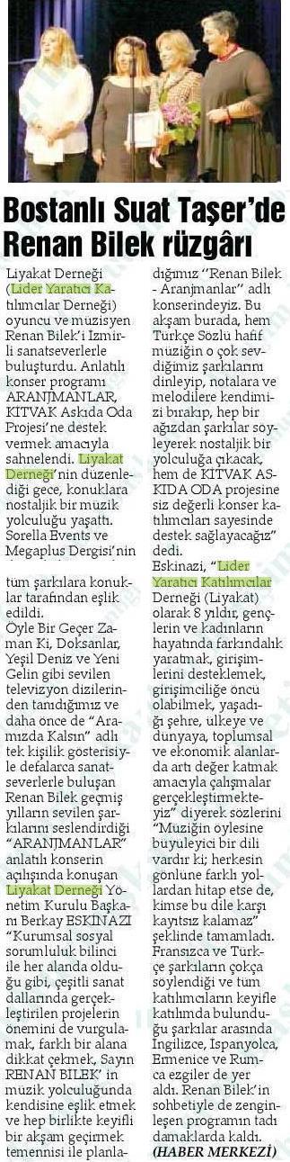 Bostanlı Suat Taşer'de Renan Bilek rüzgârı LiyakatDerneği (Lider Yaratıcı Katılımcılar Derneği) oyuncu ve müzisyen Renan Bılek'ı izmirli sanatseverlerle buluşturdu. Ani atılı konser programı ARANJMANLAR, KITVAK Astada Oda Projesi'ne destek vermek amacıyla sahnelendi, liyakat Derneği'nin düzenlediği gece, konuklara nostaljik bir müzik yolculuğu yaşattı. Sorella Evenls ve Megaplus Dergisi' nin tum şarkılara konuklar tarafından eşlik edildi. Oyle Bir Geçer Zaman Ki, Doksanlat Yeşil Deniz ve Yem Gelin gibi sevilen televizyon dizilerinden tanıdığımız ve daha once de "Aramızda Kalsın" adlı tek kişilik gösterisiyle defalarca sanatseverlerle buluşan Renan Bilek geoıuş yılların sevilen şarkılarını seslendirdiği "ARANJMANLAR" anlatılı konserin açılışında konuşan Liyakat Derneği Yönetim Kurulu Başkanı Berkay ESKINAZI "Kurumsal sosyal sorumluluk bilinci ile her alanda olduğu gibi, çeşitli sanat dallarında gerçekleştirilen projelerin önemini de vurgulamak, farklı bir alana dikkat çekmek. Sayın RENAN BİLEK' in müzik yolculuğunda kendisine eşlik etmek ve hep birlikte keyifli bir akşam geçirmek temennisi ile planladığımız "Renan Bilek -Aranjmanlar" adlı konsetindeyiz. Bu akşam burada, hem Türkçe Sozlu hafif müziğin o çok sevdiğimiz şarkılarını dinleyip, notalara ve melodilere kendimizi bırakıp, hep bir ağızdan şarkılar söyleyerek nostaljik bir yolculuğa çıkacak, hem de KITVAK ASKIDA ODA projesine siz değerli konser katılım alan sayesinde destek sağlayacağız" dedi. Eskınazi, "Lider Yaratıcı Katılımcılar Derneği (Liyakat) olarak 8 yıldır; gençlerin ve kadınların hayatında fartandalık yaratmak, girişimlerini desteklemek, girişimciliğe oncu olabilmek, yaşadığı şehre, ülkeye ve dünyaya, toplumsal ve ekonomik alanlarda artı değer katmak amacıyla çalışmalar gerçekleştirmekteyiz" diyereksozlerıni "Müziğin öylesine büyüleyici bir dili vardır ki; herkesin gönlüne farklı yollardan hitap etse de, kimse bu dile karşı kayıtsız kalamaz" şeklinde tamamladı. Fransızca ve Türkçe şarkıların çokça söylendiği ve tum kahlım cıların keyifle katılımda bulunduğu şarkılar arasında ingilizce, ispanyolca Ermenice ve Rumca ezgiler de yer aldı. Renan Bilek' in sohbetiyie de zenginleşen programın tadı damaklarda kaldı. (HABER MERKEZİ)
