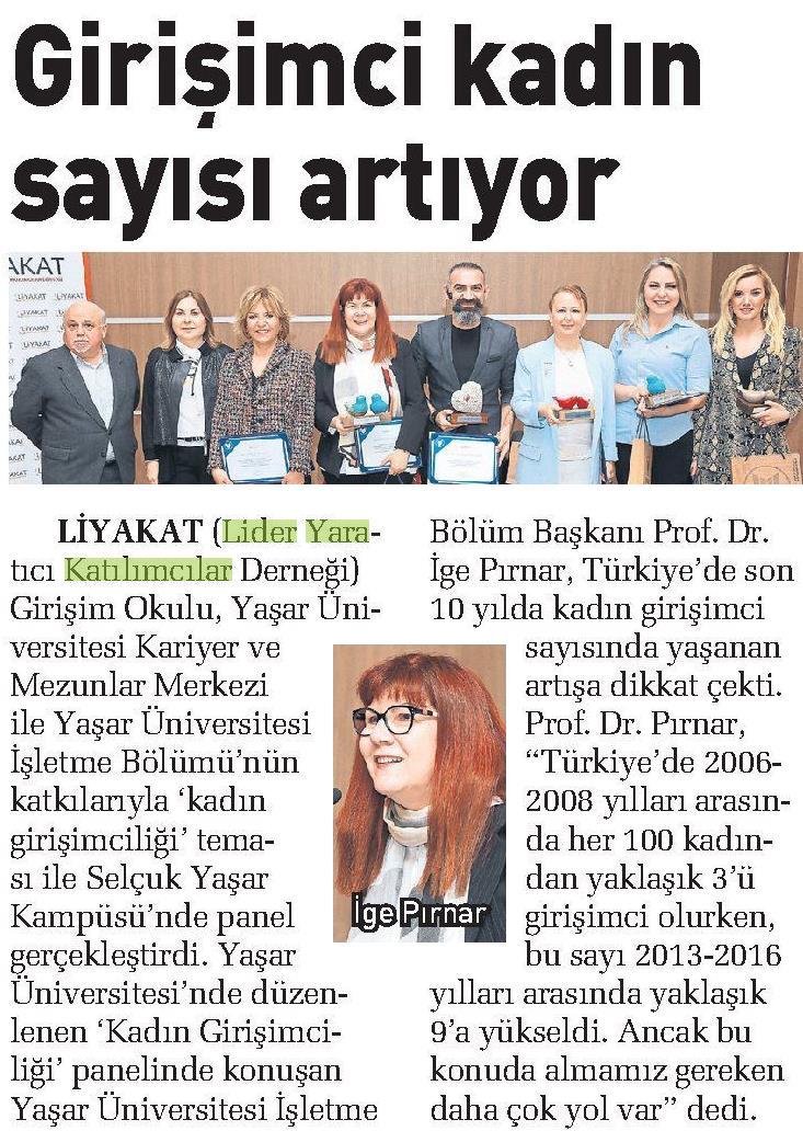 Girişimci kadın sayısı artıyor KKAT LİYAKAT (Lider Yaratıcı Katılımcılar Derneği) Girişim Okulu, Yaşar Üniversitesi Kariyer ve Mezunlar Merkezi ile Yaşar Üniversitesi İşletme Bölümü'nün katkılarıyla 'kadın girişimciliği' teması ile Selçuk Yaşar Kampüsü'nde panel gerçekleştirdi. Yaşar Üniversitesi'nde düzenlenen 'Kadın Girişimciliği' panelinde konuşan Yaşar Üniversitesi İşletme Böh'im Başkanı Prof. Dr. İge Pırnar, Türkiye'de son 10 yılda kadın girişimci sayısında yaşanan artışa dikkat çekti. Prof. Dr. Pırnar, "Türkiye'de 20062008 yılları arasında her 100 kadından yaklaşık 3'ü girişimci olurken, bu sayı 2013-2016 yılları arasında yaklaşık 9'a yükseldi. Ancak bu konuda almamız gereken daha çok yol var" dedi.