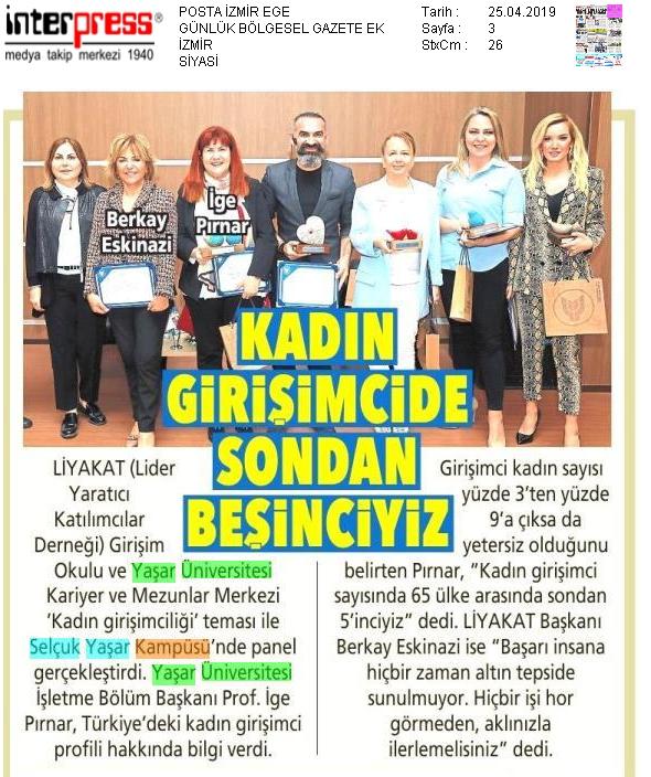 Lider Yaratıcı Katılımcılar Derneği ( Liyakat ) ''Girişim Okulu'' Yaşar Üniversitesi Kariyer ve Mezunlar Merkezi ile Yaşar Üniversitesi İşletme Bölümü katkılarıyla ''KADIN GİRİŞİMCİLİĞİ'' teması ile Selçuk Yaşar Kampüsü'nde yapıldı.